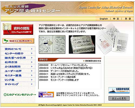 <아시아 역사자료센터>는 2001년 11월에 일본국립공문서관에 설치된 일본최초의 디지털 문서 보존소로서, 일본의 정부 기관이 소장하고 있는 아시아 역사 자료(국립공문서관, 외무성 외교사료관, 방위연구소 도서관이 소장하고 있는 메이지시대에서 2차세계대전 종전에 걸친 아시아 관계의 일본의 공문서>의 원본을 자유롭게 열람할 수 있도록 인터넷을 통한 자료 제공을 하고 있습니다.