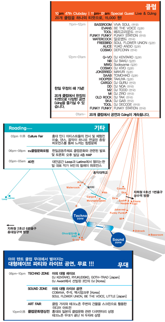 야외에서의 공연을 모두 마친 후 2005 Road Club Festival 의 또다른 축제가 시작된다. 홍대에 위치한 20개 클럽에서 일제히 진행될 Soundday 와 Clubday 는 야외 공연에서 한껏 업된 분위기를 더더욱 고조시킬 역할을 하게 된다. 15,000원의 티켓 한장을 구입하면 20개 클럽을 자유롭게 드나들며 댄스와 음악의 세계로 빠져들 수 있다. Soundday 특별 프로그램으로 25일 밤 11시부터 6개 사운드 클럽에서 일제히 일본 3팀 (Be The Voice, Yuko Ando, Soul Flower Union) 뮤지션을 포함한 특별 게스트들의 공연이 시작되며, Clubday 특별 프로그램으로 26일 12시부터~ 새벽1시까지 총 14개 댄스 클럽에서 한국 DJ AWARD 수상자와 일본 DJ( DJ Kentaro, Mayuri, Sodeyama, DJ Baku, DJ Kiyo) 기타 특별 DJ 들이 일제히 공연을 펼치게 된다. 눈과 귀와 몸을 동시에 즐겁게 할 종합선물세트격인 시간이 마련될 것이다.