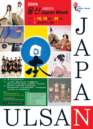재부산일본국총영사관에서는 오는 10월19일부터 29일까지 울산광역시에서「울산 JAPAN WEEK」를 개최한다.「JAPAN WEEK」는 1998년 10월 한일공동선언 및 행동계획, 2003년 6월의 한일정상공동성명에서 발표된 지역간 교류확대 증진을 위해 매년 한국의 지방도시에서 개최해 오고 있으며, 이번 「울산 JAPAN WEEK」는 공주시 개최에 이어 9번째로 개최하는 행사이다.