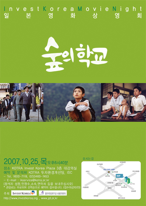 일본국제교류기금서울문화센터와 KOTRA의 공동주최로, 생명을 키우는 자연의 따스함과 함께 생명의 소중함을 테마로 만든 「숲의 학교」상영회를 가집니다.
