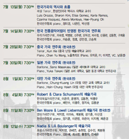한국반주협회가 주최하며, 경향신문사가 주관하는 <세계예술가곡초청연주회>가 7/13~8/13까지 장천아트홀에서 열립니다. 특히, 7월 30일에는 한국에서는 처음으로 일본가곡연주회가 개최되오니 관심있는 분의 관람을 기다립니다.
