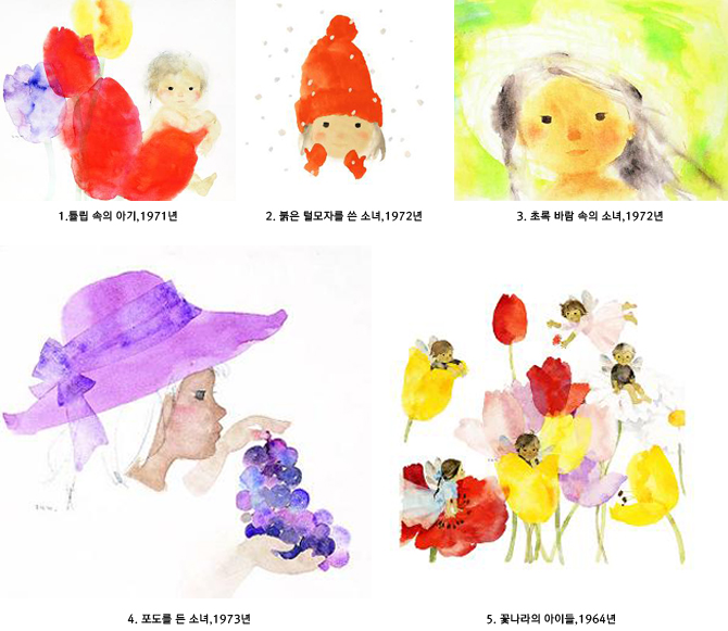 이와사키 치히로는 ‘어린이’를 평생의 주제로 삼아 그렸던 화가입니다. 모델 없이 생후 10개월 된 아이와 한 살 난 아기를 구분하여 표현하는 등 그 뛰어난 관찰력과 데생력으로9400점 이상의 작품 속에 아이들의 다양한 모습들을 그려냈습니다. 붓에 물을 듬뿍 묻혀 밑그림 작업 없이 그려낸 어린 아이의 살결은 부드러우면서도 탄력이 넘치고 건강한 생명력을 품고 있습니다.