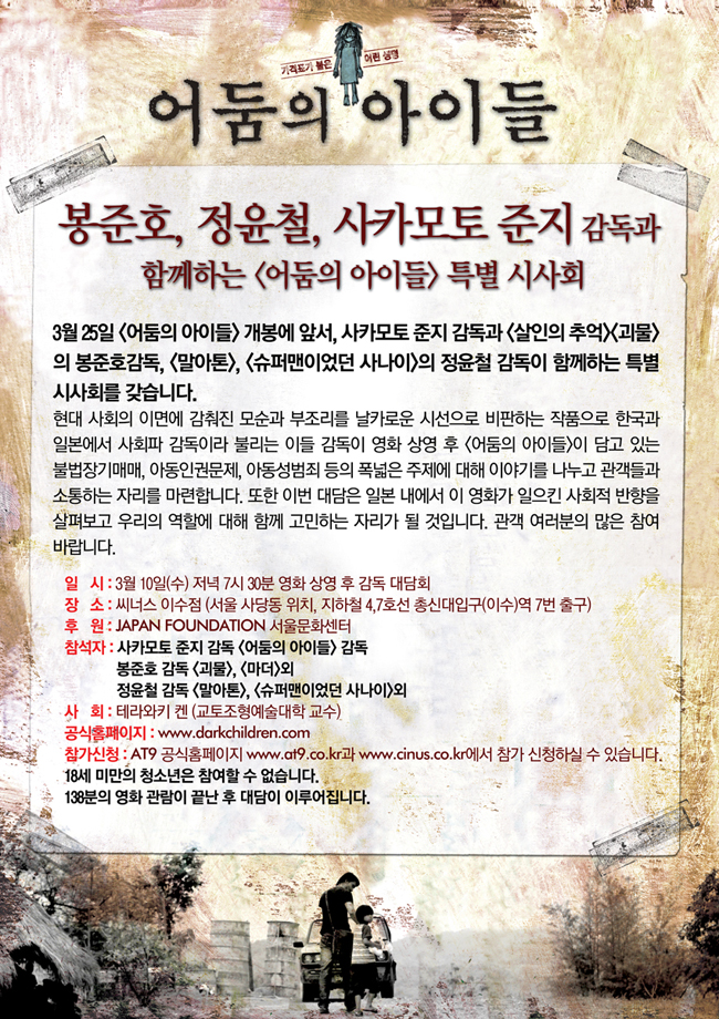 일본국제교류기금 서울문화센터(THE JAPAN FOUNDATION)이 후원하는 <어둠의 아이들>특별시사회 및 감독대담회가 3월 10일(수) 저녁 7시 30분 씨너스 이수에서 개최합니다.