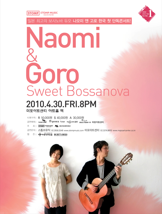 일본국제교류기금 서울문화센터(THE JAPAN FOUNDATION)가 후원하여 오는 4월 30일 마포아트센터에서 열리는 일본 출신의 보사노바 듀오 나오미 앤 고로(Naomi & Goro)가 한국에서 첫 번째 단독 콘서트 [스윗 보사노바 Sweet Bossanova]를 가집니다. 나오미 앤 고로(Naomi & Goro)는 세계적인 아티스트 ‘사카모토 류이치’가 인정하고 ‘조앙 질베르토 ‘ ‘리사 오노’에 이어 보사노바의 명맥을 이어갈 미니멀 보사노바의 대명사로 불려지고 있습니다. 싱그러운 봄날의 달콤한 주스 같은 음악을 가장 트렌디한 음악으로, 가장 감각적인 연주를 선보이므로 많은 관심 부탁드립니다.