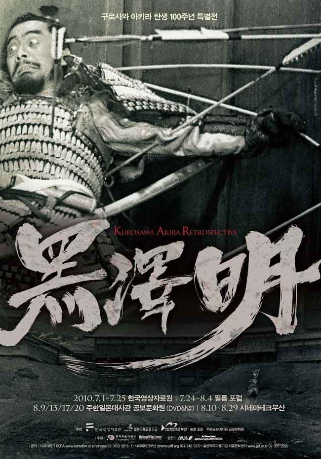 일본국제교류기금(THE JAPAN FOUNDATION)과 한국영상자료원, 필름포럼, 시네마테크부산, 공보문화원이 공동주최하는 <구로사와 아키라 탄생 100주년 기념 영화제>가 오는 7월1일부터 8월29일까지 한국영상자료원을 시작으로 무료상영회를 개최합니다.
