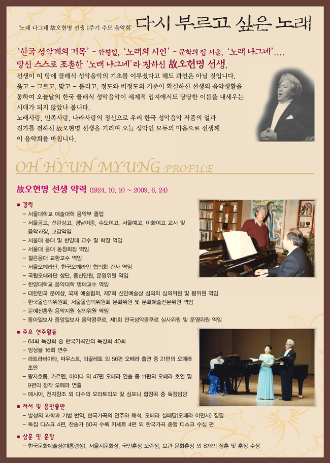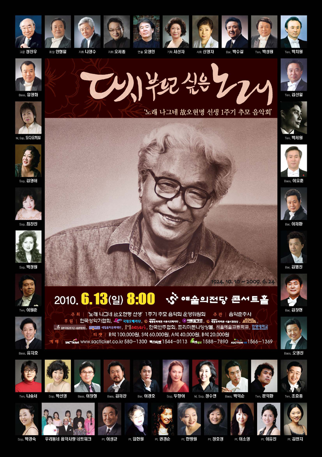 일본국제교류기금 서울문화센터(THE JAPAN FOUNDATION)가 후원하는 <故 오현명 선생의 추모 음악회>가 오는 6월 13일(일) 오후 8시 예술의전당 콘서트 홀에서 개최됩니다. 이번 음악회는 <노래사랑, 민족사랑, 나라사랑>의 정신으로 우리 한국 성악음악 작품의 얼과 진가를 전하신 故 오현명 선생을 기리는 마음으로 故 오현명 선생의 제자와 함께 한국성악인들이 준비한 추모 악회입니다. 많은 분들의 관심 부탁드립니다.
