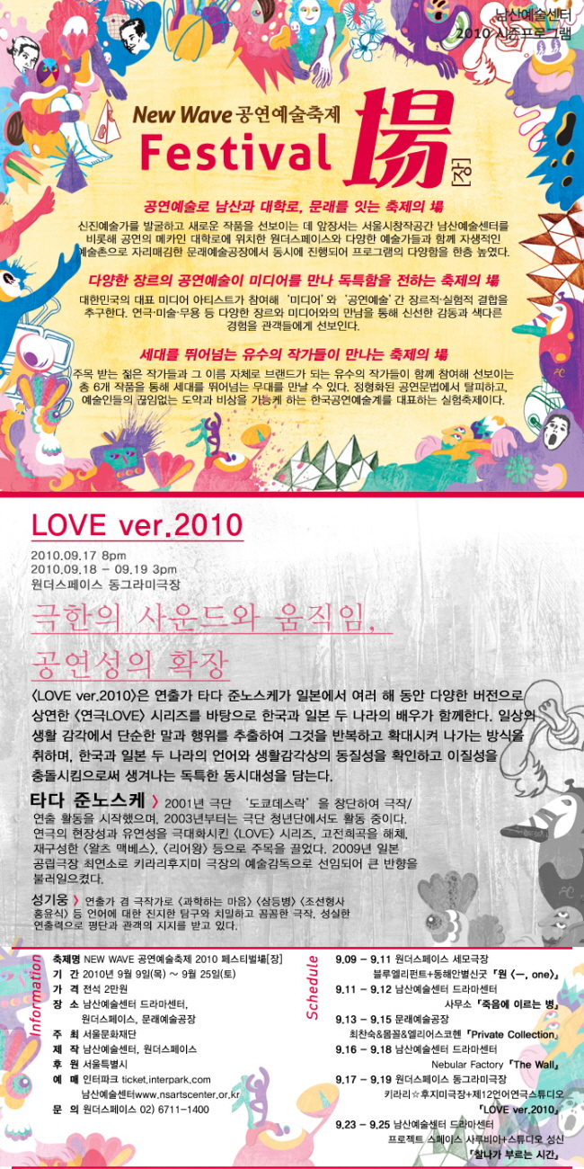일본국제교류기금(JAPAN FOUNDATION)이 후원하는 ‘NEW WAVE 공연예술축제 2010 페스티벌 장’이 9월 9일(목)부터 9월 25일(토)까지 남산 및 대학로에서 펼쳐집니다.