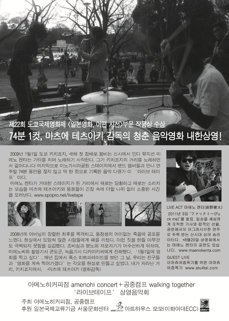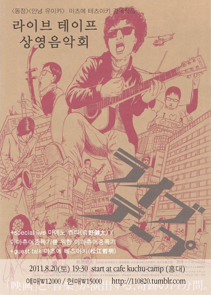일본국제교류기금 서울문화센터(JAPAN FOUNDATION)가 후원하는 <라이브 테이프 상영음악회>가 오는 8월 20일(토) 19시 30분 홍대 공중 캠프에서 개최됩니다. 이번 상영음악회에는 마쓰에 데쓰아키 감독과 주연이자 싱어송라이터인 마에노 겐타 씨도 내한하여 한국관객과 교류를 가질 예정이오니 많은 관심 부탁드립니다.