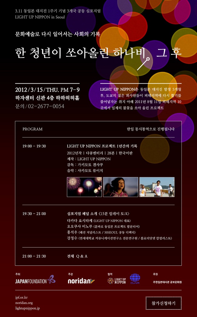3.11 동일본 대지진 1주기를 기념해 LIGHT UP NIPPON의 다큐멘터리 상영과 심포지엄을 통하여 일본 젊은이들의 생생한 활동 모습을 한국에 전하고, 일본 사회뿐만 아니라 동시대를 살아가는 청년들이 문화와 예술을 통해 할 수 있는 일에 대해 실제 사례를 통해서 논의하고 공유하는 자리가 될 것입니다.