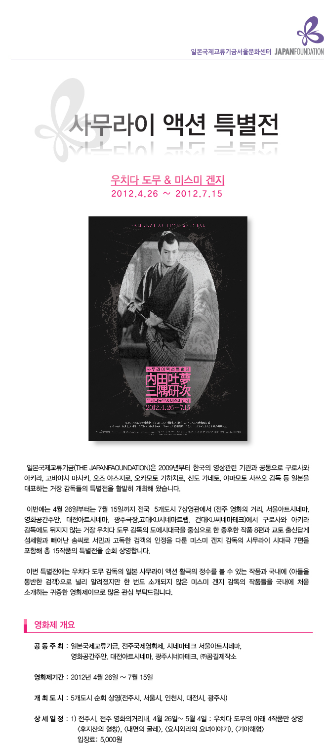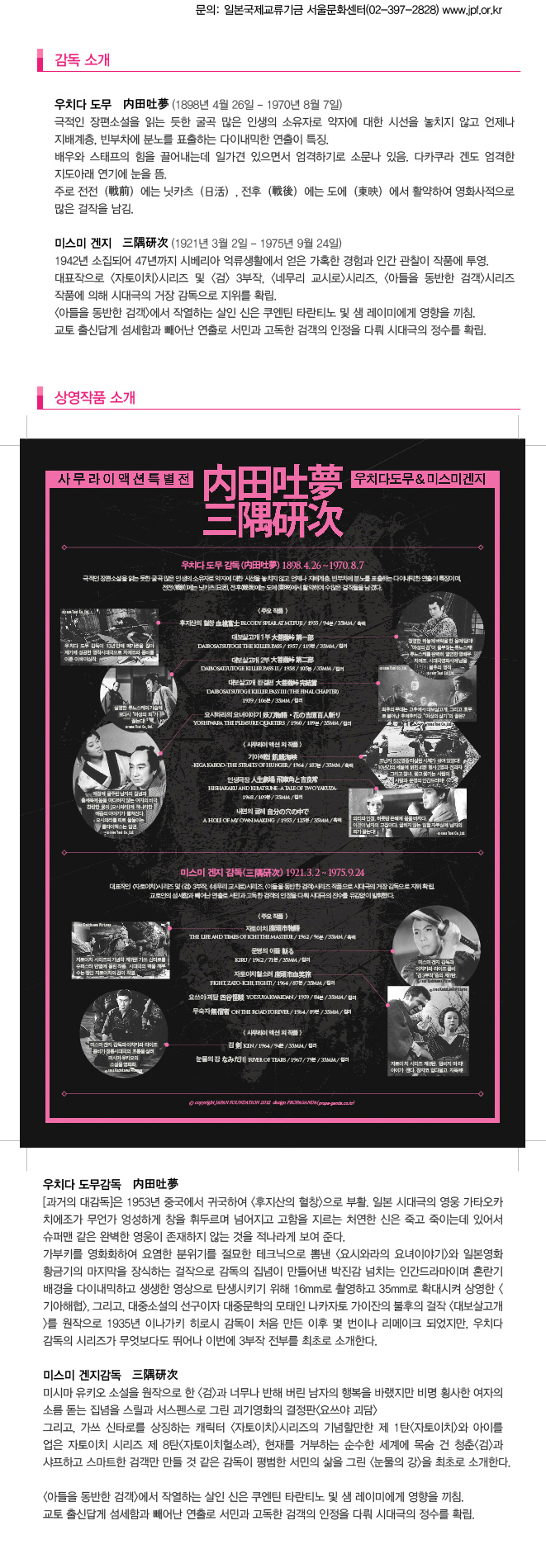 일본국제교류기금(The Japan Foundation)은 2009년부터한국의 영상관련 기관과 공동으로 구로사와아키라, 고바야지 마사키, 오즈 야스지로, 오카모토 가하치로, 신도 가네토, 야마모토 사쓰오 감독등 일본을 대표하는 거장감독들의 특별전을 활발히 개최해왔습니다.