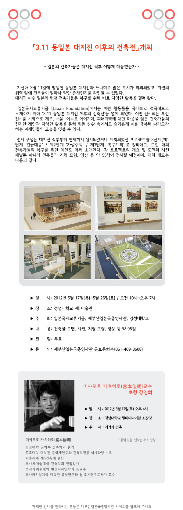 지난해 3월 11일에 발생한 동일본 대지진과 쓰나미로 많은 도시가 파괴되었고, 자연의 위력 앞에 건축물이 얼마나 약한 존재인지를 확인할 수 있었다.대지진 이후 일본의 현대 건축가들은 복구를 위해 바로 다양한 활동을펼쳐 왔다.
