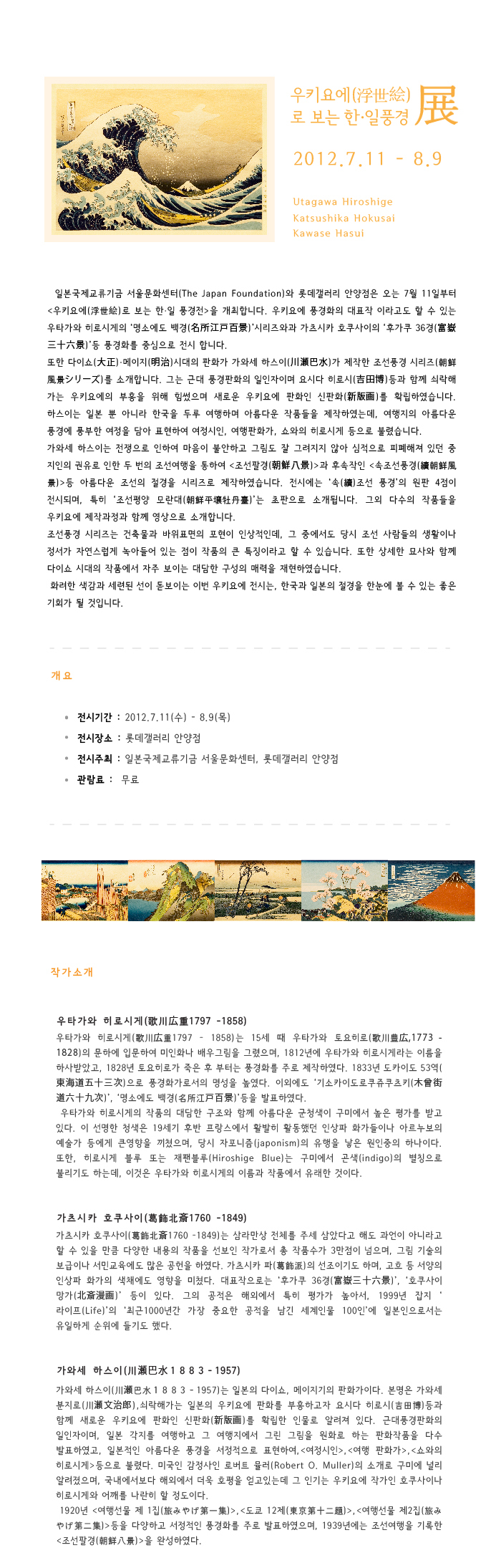 일본국제교류기금 서울문화센터(The Japan Foundation)와 롯데갤러리 안양점은 오는 7월 11일부터 <우키요에(浮世絵)로 보는 한·일 풍경전>을 개최합니다.