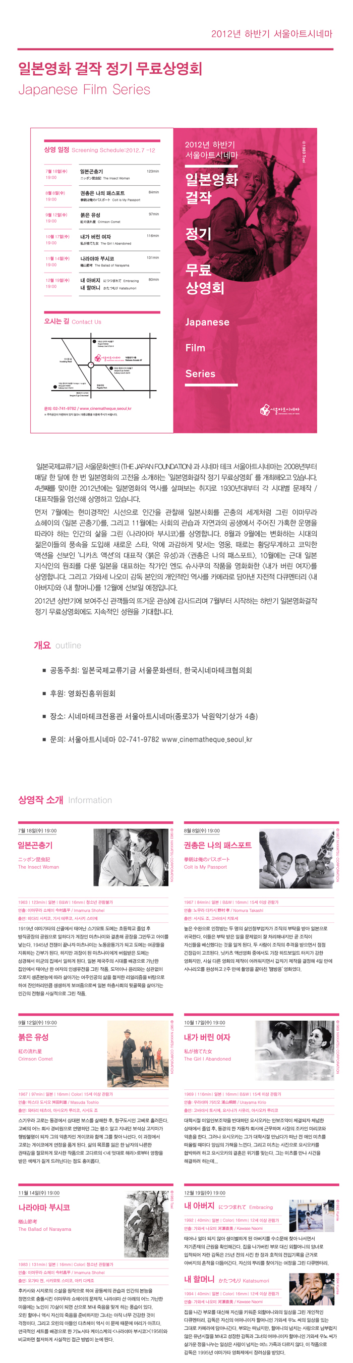 일본국제교류기금 서울문화센터(THE JAPANFOUNDATION)과 시네마테크 서울아트시네마는 2008년부터 매달 한 달에 한 번 일본영화의 고전을 소개하는 ‘일본영화걸작 정기 무료상영회’를 개최해오고 있습니다.