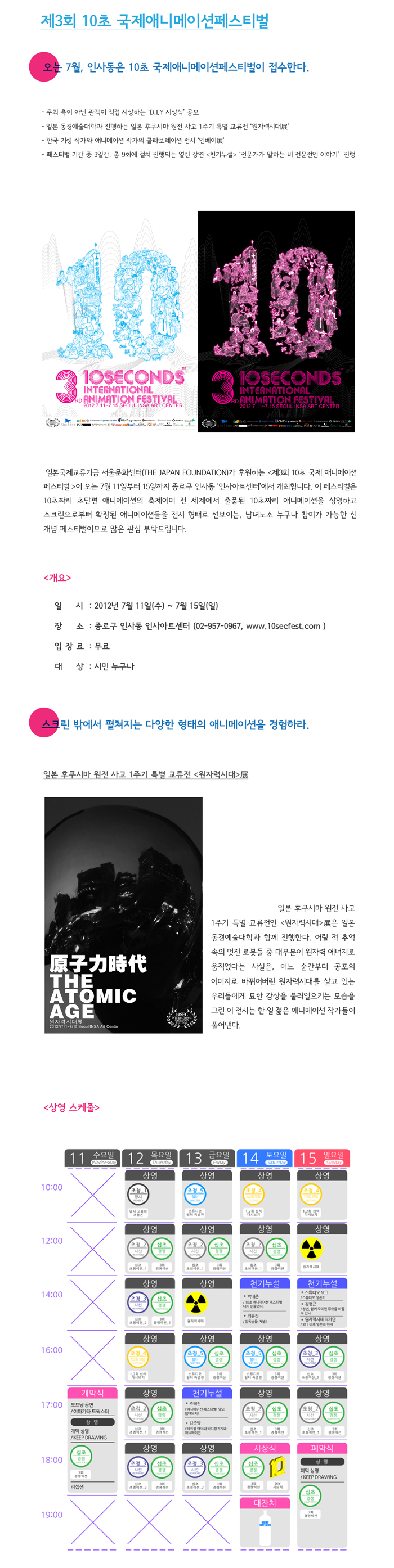 일본국제교류기금 서울문화센터(THE JAPANFOUNDATION)가 후원하는 <제3회 10초 국제 애니메이션 페스티벌 >이 오는 7월 11일부터 15일까지 종로구 인사동 ‘인사아트센터’에서 개최합니다.