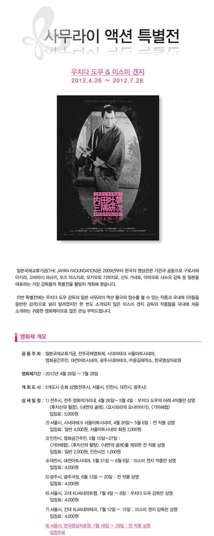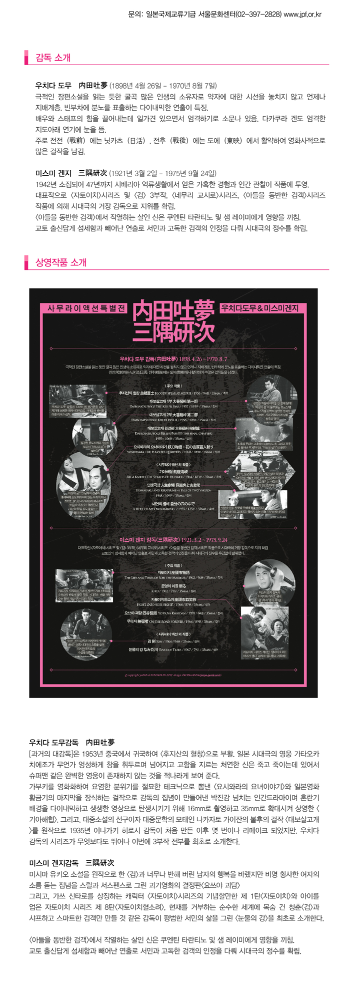 일본국제교류기금(The Japan Foundation)은 2009년부터한국의 영상관련 기관과 공동으로 구로사와아키라, 고바야지 마사키, 오즈 야스지로, 오카모토 가하치로, 신도 가네토, 야마모토 사쓰오 감독등 일본을 대표하는 거장감독들의 특별전을 활발히 개최해왔습니다.