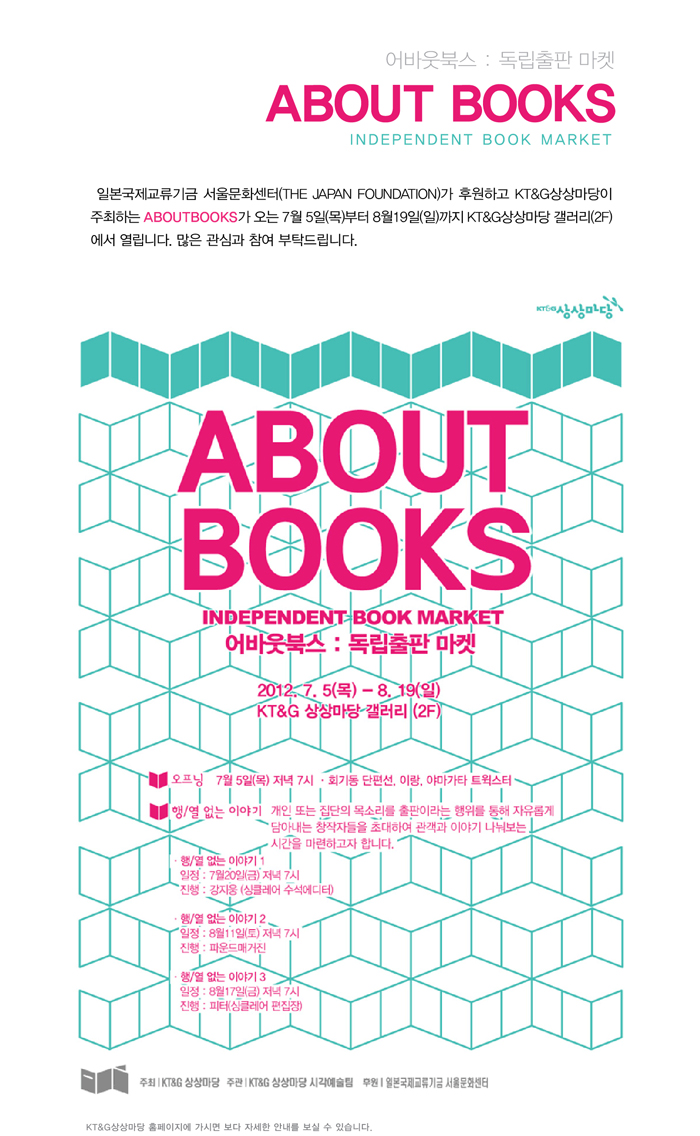 일본국제교류기금 서울문화센터(THE JAPAN FOUNDATION)가 후원하고 KT&G상상마당이 주최하는 ABOUTBOOKS가 오는 7월 5일(목)부터 8월19일(일)까지 KT&G상상마당 갤러리(2F) 에서 열립니다. 많은 관심과 참여 부탁드립니다.