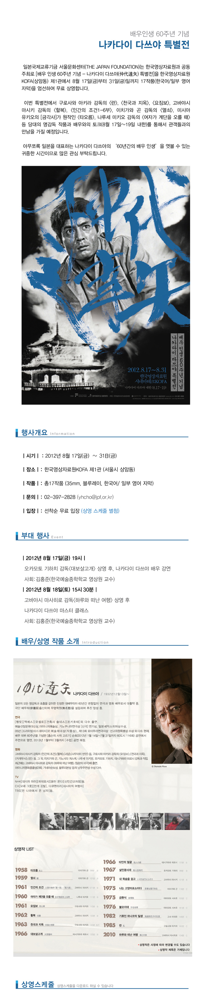 일본국제교류기금 서울문화센터는 한국영상자료원과 공동 주최로 [배우 인생 60주년 기념 - 나카다이 다쓰야(仲代達矢) 특별전]을 한국영상자료원KOFA(상암동) 제1관에서 8월 17일(금)부터 30일(목)일까지 17작품(한국어/일부 영어 자막)을 엄선하여 무료 상영합니다.