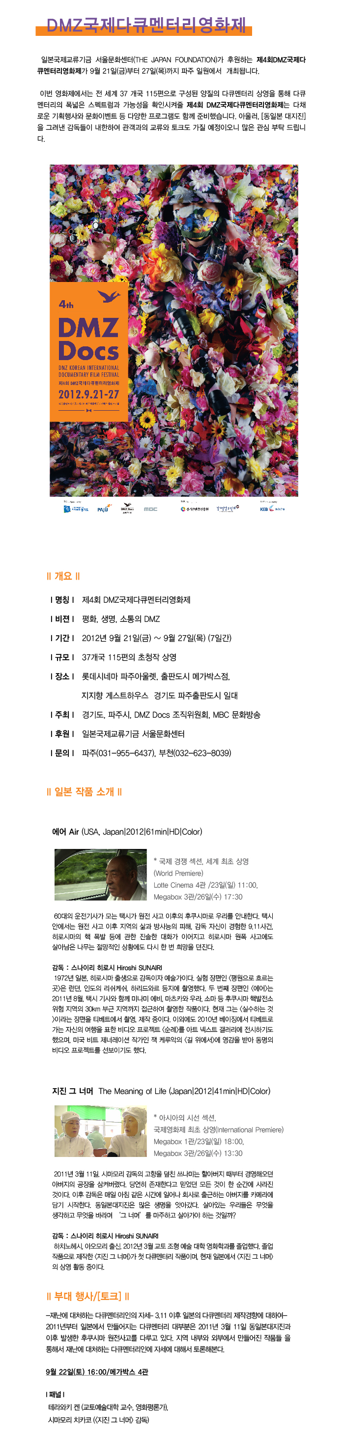 일본국제교류기금 서울문화센터(THE JAPAN FOUNDATION)가 후원하는 제4회DMZ국제다큐멘터리영화제가 9월 21일(금)부터 27일(목)까지 파주 일원에서 개최됩니다.