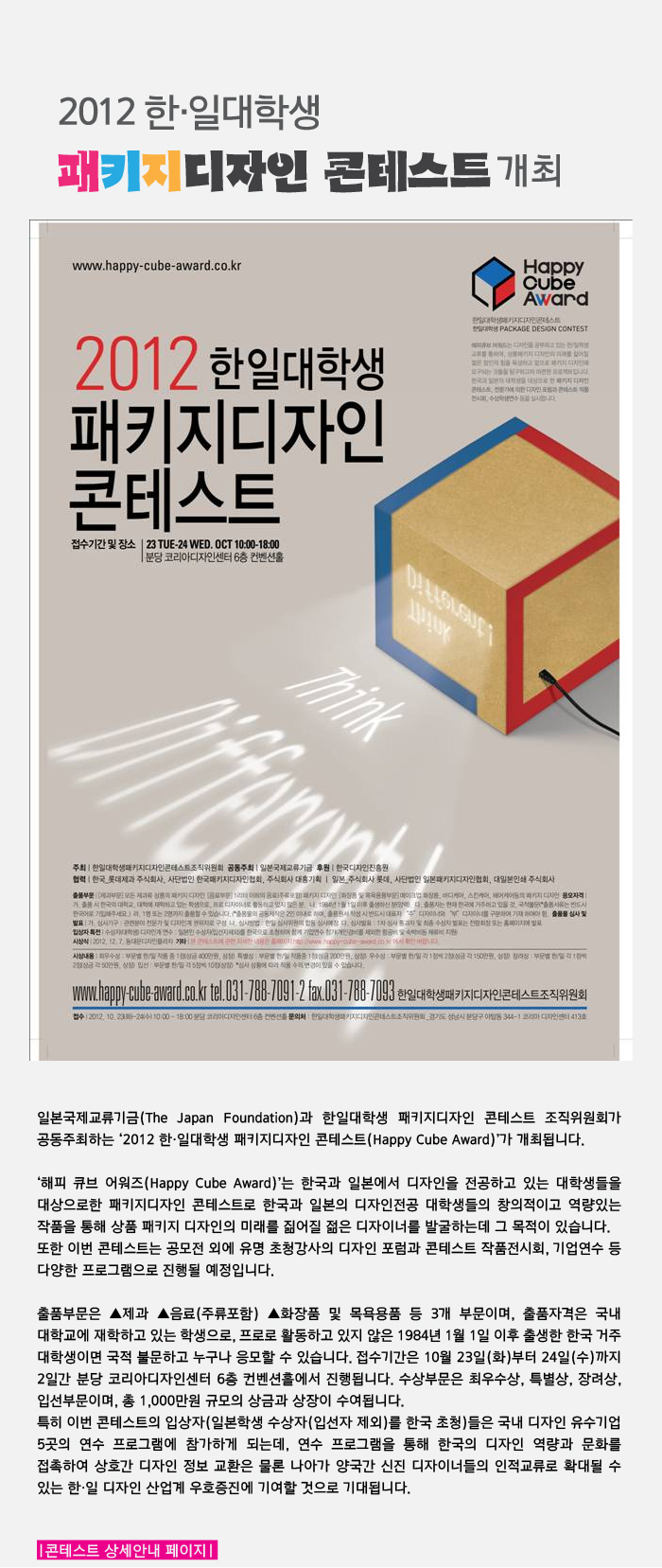 한·일대학생 패키지디자인 콘테스트 조직위원회 홈페이지 www.happy-cube-award.co.kr