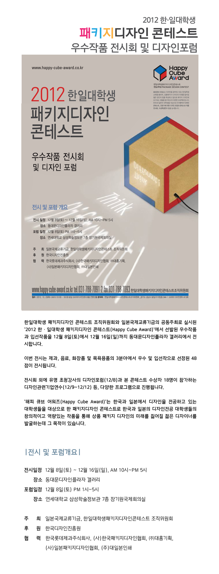한일대학생 패키지디자인 콘테스트 조직위원회와 일본국제교류기금의 공동주최로 실시된 ‘2012 한∙일대학생 패키지디자인 콘테스트(Happy Cube Award)’에서 선발된 우수작품과 입선작품을 12월 8일(토)에서 12월 16일(일)까지 동대문디자인플라자 갤러리에서 전시합니다.