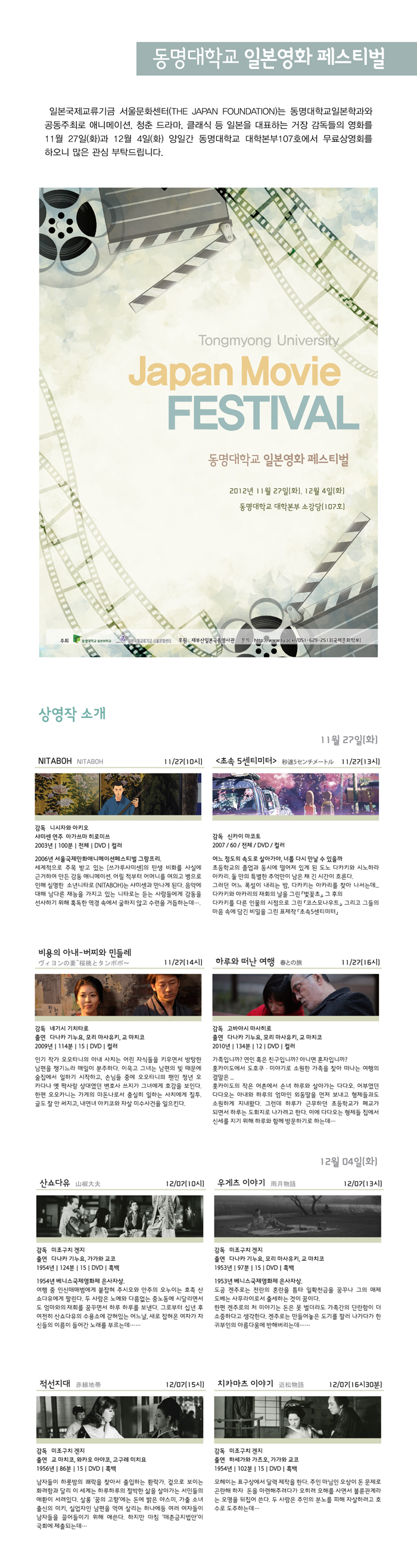 일본국제교류기금 서울문화센터(THE JAPANFOUNDATION)는 동명대학교일본학과와 공동주최로 애니메이션, 청춘 드라마, 클래식 등 일본을 대표하는 거장 감독들의 영화를 11월 27일(화)과 12월 4일(화) 양일간 동명대학교 대학본부107호에서 무료상영회를 하오니 많은 관심 부탁드립니다.