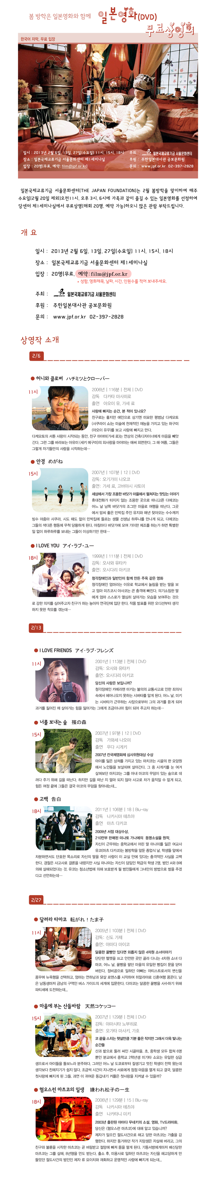 일본국제교류기금 서울문화센터(THE JAPANFOUNDATION)는 2월 봄방학을 맞이하여 매주 수요일(2월 20일 제외)오전11시, 오후 3시, 6시에 가족과 같이 즐길 수 있는 일본영화를 선정하여 당센터 제1세미나실에서 무료상영(매회 20명, 예약 가능)하오니 맞은 관람 부탁드립니다.