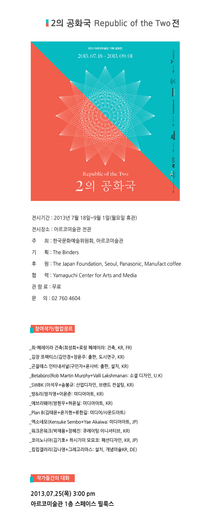 전시기간 : 2013년 7월 18일~9월 1일(월요일 휴관)전시장소 : 아르코미술관 전관주 최 : 한국문화예술위원회, 아르코미술관
