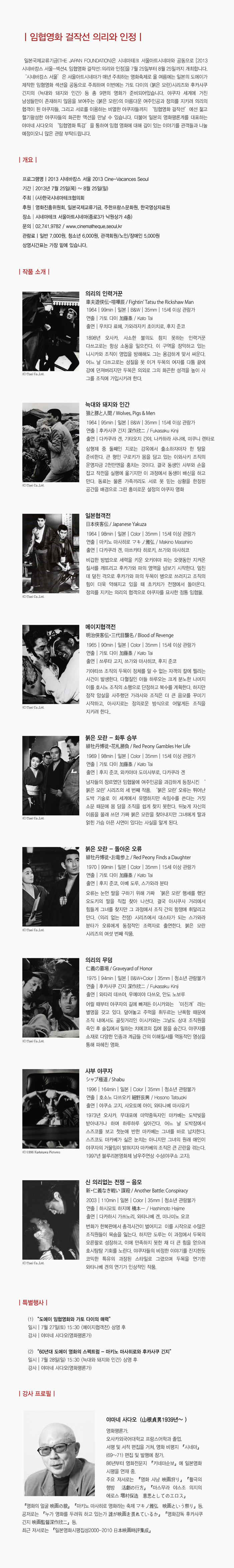일본국제교류기금(THE JAPANFOUNDATION)은 시네마테크 서울아트시네마와 공동으로 [2013 시네바캉스 서울-섹션4. 임협영화 걸작선:의리와 인정]을 7월 25일부터 8월 25일까지 개최합니다.