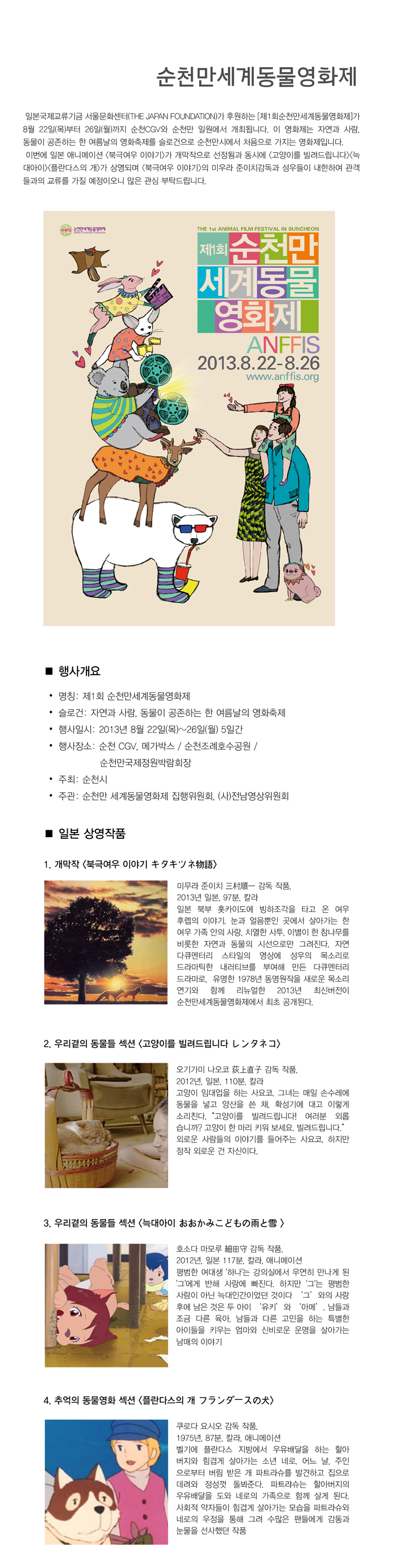 일본국제교류기금 서울문화센터(THE JAPANFOUNDATION)가 후원하는 [제1회순천만세계동물영화제]가 8월 22일(목)부터 26일(월)까지 순천CGV와 순천만 일원에서 개최됩니다.
