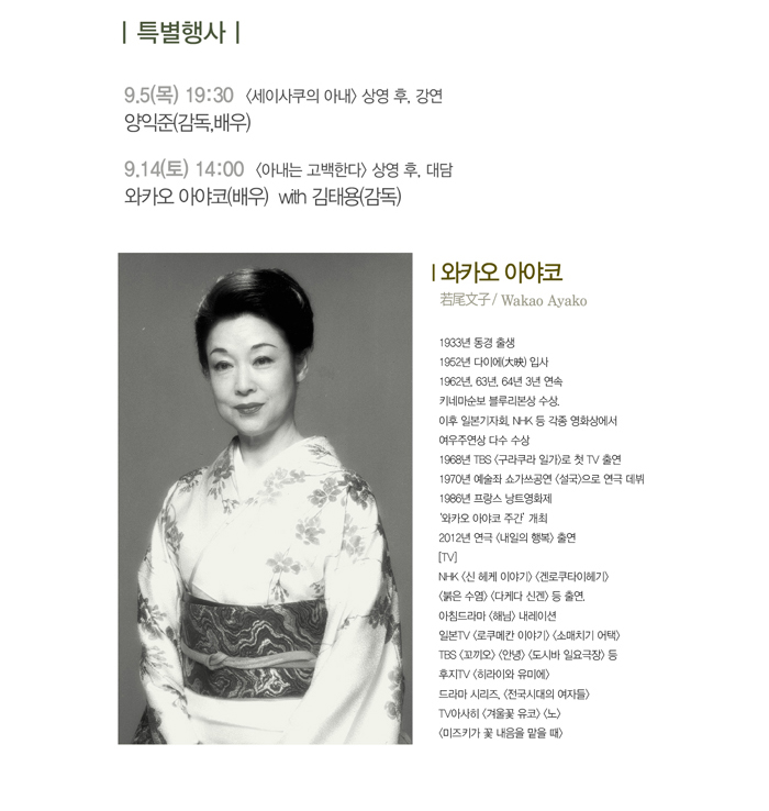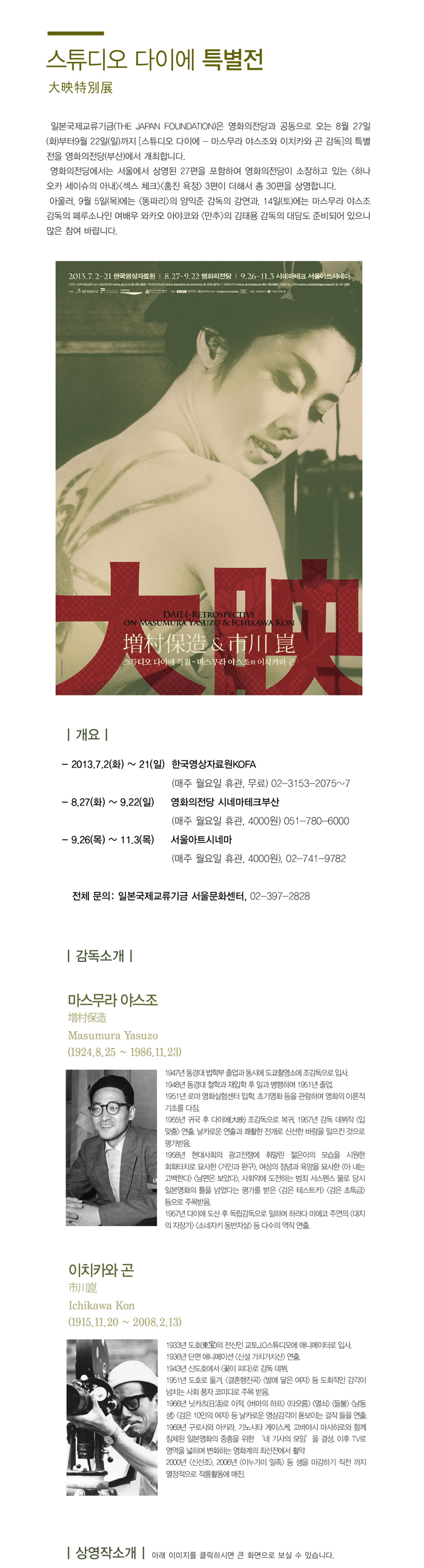 일본국제교류기금(THE JAPANFOUNDATION)은 영화의전당과 공동으로 오는 8월 27일(화)부터9월 22일(일)까지 [스튜디오 다이에 - 마스무라 야스조와 이치카와 곤 감독]의 특별전을 영화의전당(부산)에서 개최합니다.