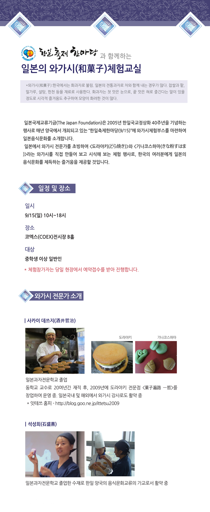 일본국제교류기금(The Japan Foundation)은 2005년 한일국교정상화 40주년을 기념하는 행사로 매년 양국에서 개최되고 있는 “한일축제한마당(9/15)”에 와가시체험부스를 마련하여 일본음식문화를 소개합니다.