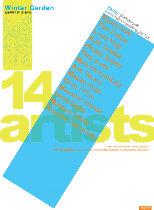 일본국제교류기금은 주한일본대사관 공보문화원, 주제주일본국총영사관, 재부산일본국총영사관, 국립제주박물관과 공동주최로, 일본국제교류기금 해외순회전 ‘윈터가든:일본현대미술의 마이크로팝(Micropop)적 상상력 전개’ 전을 개최합니다. 오는 9월 2일(월) 서울 전시를 시작으로, 10월 16일 제주, 12월 3일 부산으로 일정이 이어지며, 아오키 료코, 이즈미 타로, 오치아이 탐, 구도 마키코, 구니카타 마호미, 사에키 히로에, 스기토 히로시, 다카노 아야, 다나카 코키, 치바 마사야, Chim↑Pom, 한다 마사노리, 야기 료타, 야마모토 케스케 14인의 작가의 작품 35점이 소개됩니다. 주로 드로잉과 영상작품으로 구성된 본 전시는 일본의 개성 넘치는 현대 미술의 단면을 엿보는데 부족함이 없는 전시가 될 것입니다. 많은 분들의 관람을 기대합니다.