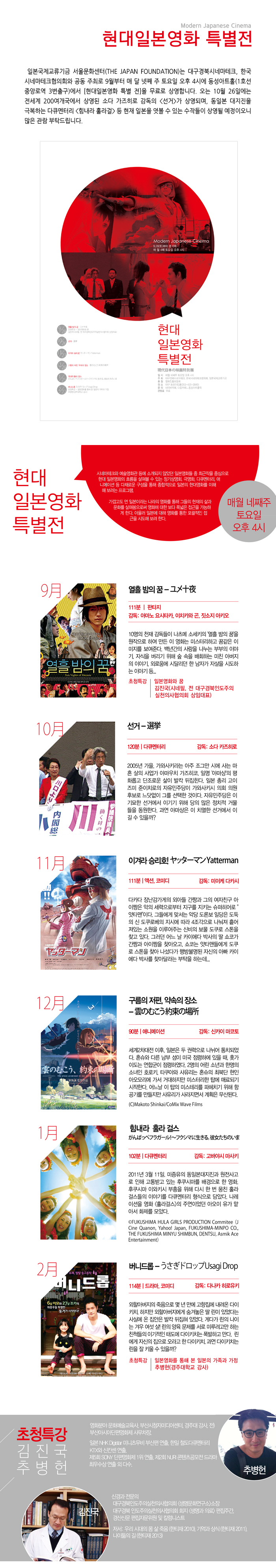 일본국제교류기금 서울문화센터(THE JAPAN FOUNDATION)는 대구경북시네마테크, 한국시네마테크협의회와 공동 주최로 9월부터 매 달 넷째 주 토요일 오후 4시에 [현대일본영화특별전]을 무료로 상영합