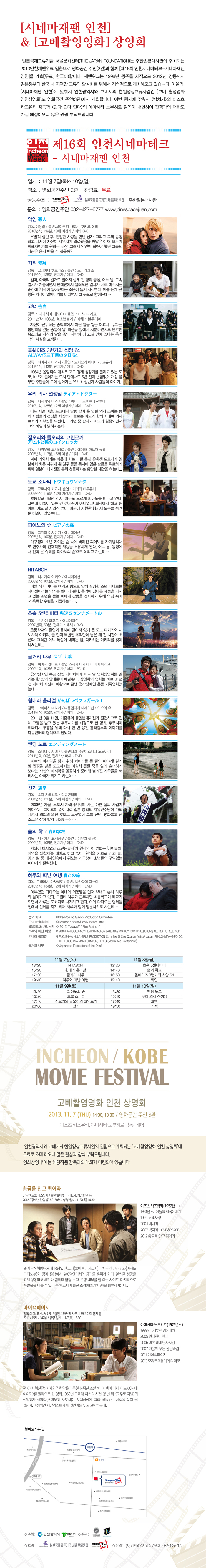 일본국제교류기금 서울문화센터(THE JAPANFOUNDATION)는 주한일본대사관이 주최하는 2013인천재팬위크 일환으로 영화공간 주안(2관)과 함께 [제16회 인천시네마테크-시네마재팬 인천]을 개최(무료, 한국어)합니다