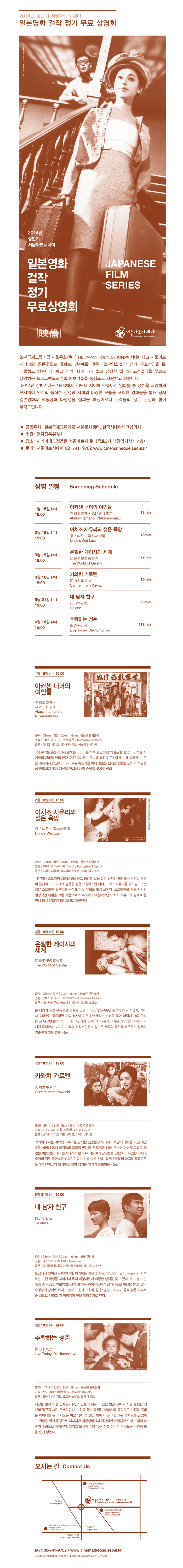 일본국제교류기금 서울문화센터(THE JAPAN FOUNDATION)는 시네마테크 서울아트시네마와 공동주최로 올해로 7년째를 맞은 ‘일본영화걸작 정기 무료상영회’를 개최하고 있습니다.