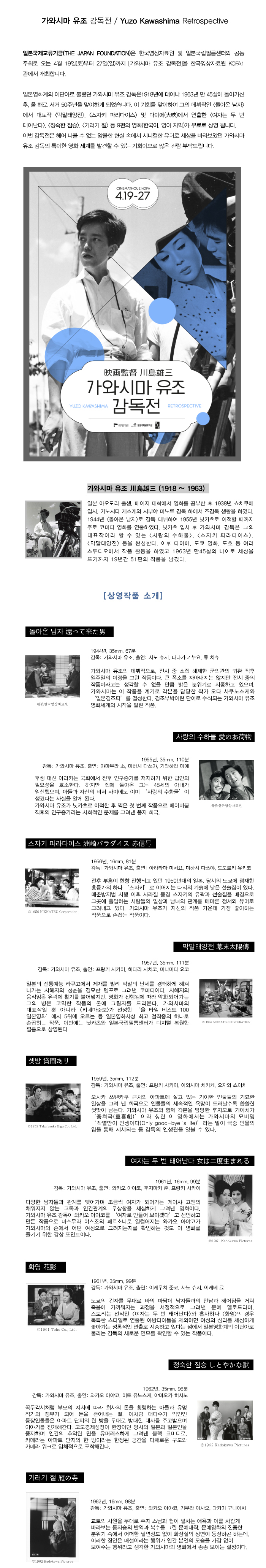 일본국제교류기금(THE JAPAN FOUNDATION)은 한국영상자료원 및 일본국립필름센터와 공동 주최로 오는 4월 19일(토)부터 27일(일)까지 [가와시마 유조 감독전]을 한국영상자료원 KOFA1관에