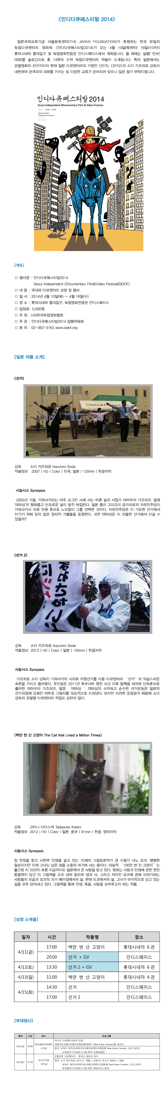 일본국제교류기금 서울문화센터(THE JAPAN FOUNDATION)가 후원하는 한국 유일의 독립다큐멘터리 영화제 <인다다큐페스티발2014>가 오는 4월 10일(목)부터 16일(수)까지 롯데시네마 홍대입구 및 독립영화전용관 인디스페이스에서 개최됩니다.