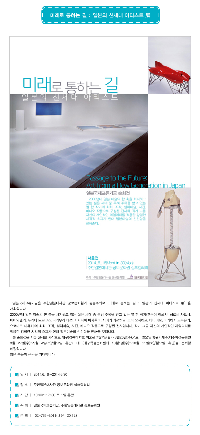 일본국제교류기금은 주한일본대사관 공보문화원과 공동주최로 ‘미래로 통하는 길 : 일본의 신세대 아티스트 展’을 개최합니다.
