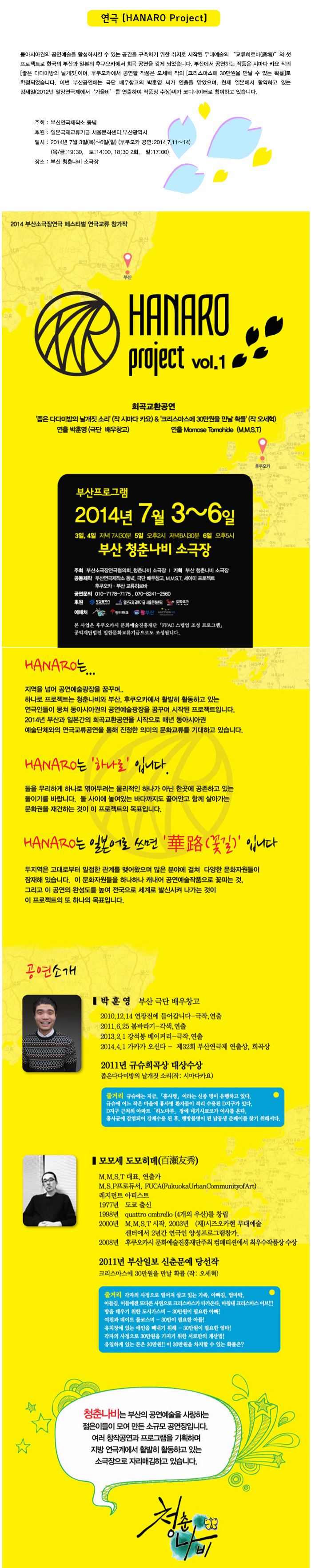동아시아권의 공연예술을 활성화시킬 수 있는 공간을 구축하기 위한 취지로 시작된 무대예술의 “교류히로바(廣場)”의 첫 프로젝트로 한국의 부산과 일본의 후쿠오카에서 희곡 공연을 갖게 되었습니다. 부산에서 공연하는 작품 시마다 카요 작의 [좋은 다다미방의 날개짓]이며, 후쿠오카에서 공연할 작품은 오세혁 작의 [크리스마스에 30만원을 만날 수 있는 확률]로 확정되었습니다. 이번 부산공연에는 극단 배우창고의 박훈영 씨가 연출을 맡았으며, 현재 일본에서 활약하고 있는 김세일(2012년 일양연극제에서 ‘가을비’를 연출하여 작품상 수상)씨가 코디네이터로 참여하고 있습니다.