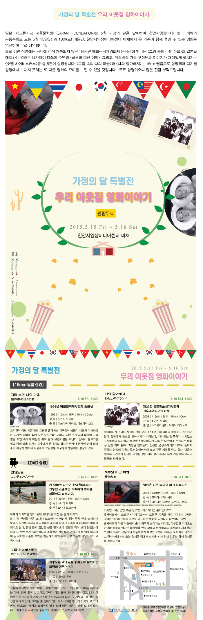 일본국제교류기금 서울문화센터(JAPAN FOUNDATION)는 5월 가정의 달을 맞이하여 천안시영상미디어센터 비채와 공동주최로 오는 5월 15일(금)과 16일(토) 이틀간, 천안시영상미디어센터 비채에서 온 가족이 함께 즐길 수 있는 영화를 엄선하여 무료 상영합니다.