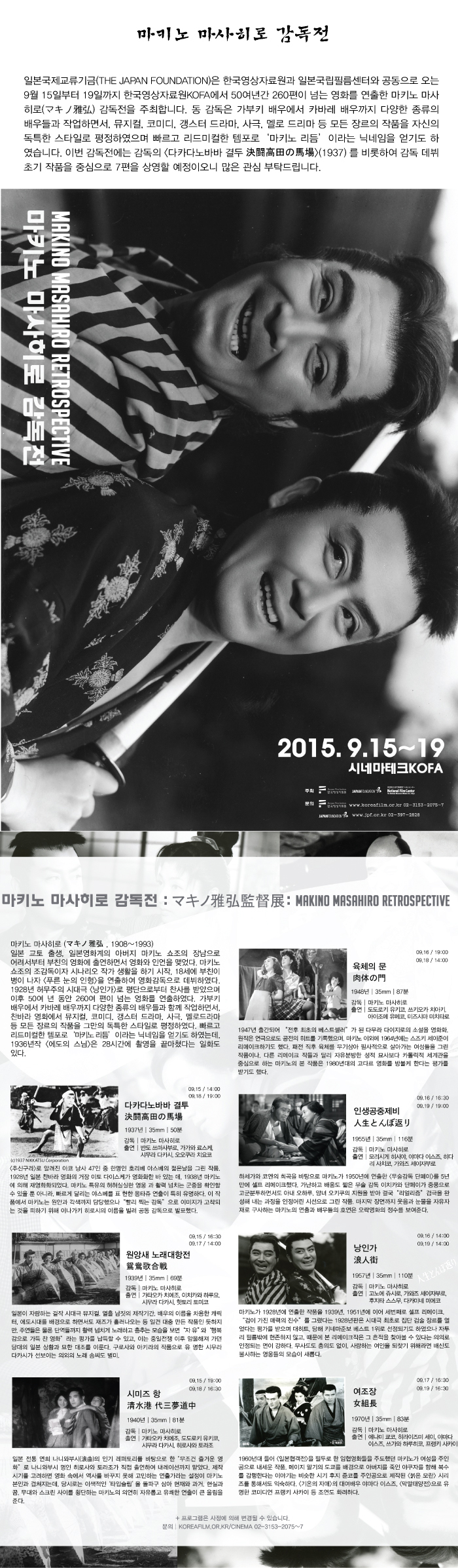 일본국제교류기금(THE JAPAN FOUNDATION)은 한국영상자료원과 일본국립필름센터와 공동으로 오는 9월 15일부터 19일까지 한국영상자료원KOFA에서 50여년간 260편이 넘는 영화를 연출한 마키노 마사히로(マキノ雅弘) 감독전을 주최합니다. 동 감독은 가부키 배우에서 카바레 배우까지 다양한 종류의 배우들과 작업하면서, 뮤지컬, 코미디, 갱스터 드라마, 사극, 멜로 드리마 등 모든 장르의 작품을 자신의 독특한 스타일로 평정하였으며 빠르고 리드미컬한 템포로 ‘마키노 리듬’이라는 닉네임을 얻기도 하였습니다. 이번 감독전에는 감독의 <다카다노바바 결두 決闘高田の馬場>(1937) 를 비롯하여 감독 데뷔 초기 작품을 중심으로 7편을 상영할 예정이오니 많은 관심 부탁드립니다.