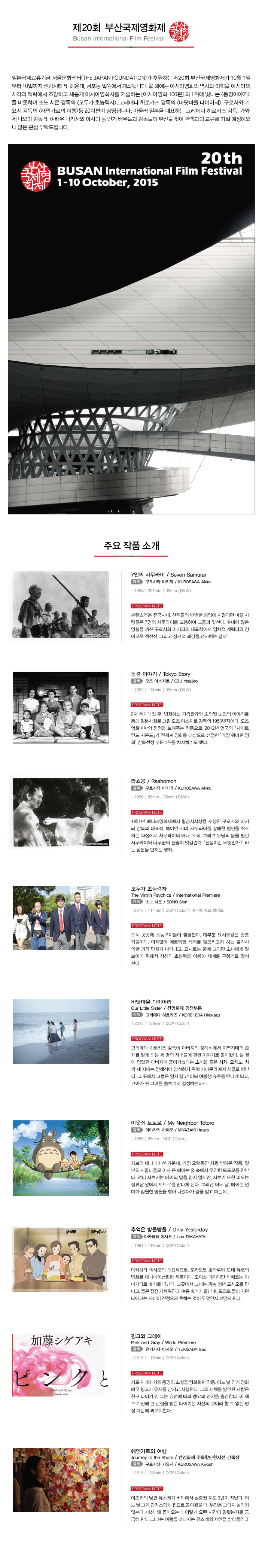 일본국제교류기금 서울문화센터(THE JAPAN FOUNDATION)가 후원하는 제20회 부산국제영화제가 10월 1일부터 10일까지 센텀시티 및 해운대, 남포동 일원에서 개최됩니다. 올 해에는 아시아영화의 역사와 미학을 아시아의 시각과 맥락에서 조망하고 새롭게 아시아영화사를 기술하는 [아시아영화 100편] 의 1위에 빛나는 <동경이야기>를 비롯하여 소노 시온 감독의 <모두가 초능력자>, 고레에다 히로카즈 감독의 <바닷마을 다이어리>, 구로사와 기요시 감독의 <해안가로의 여행>등 20여편이 상영됩니다. 아울러 일본을 대표하는 고레에다 히로카즈 감독, 가와세 나오미 감독 및 여배우 나가사와 마사미 등 인기 배우들과 감독들이 부산을 찾아 관객과의 교류를 가질 예정이오니 많은 관심 부탁드립니다.