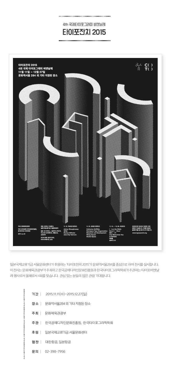 일본국제교류기금 서울문화센터가 후원하는 '타이포잔치 2015'가 문화역서울284를 중심으로 하여 전시를 실시합니다.