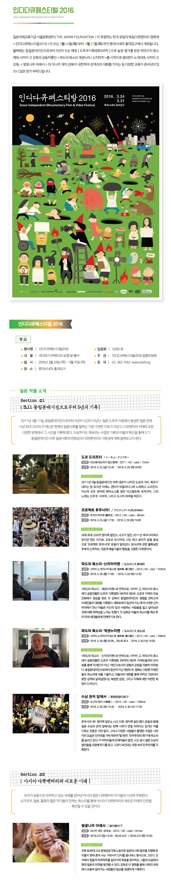 일본국제교류기금 서울문화센터(THE JAPAN FOUNDATION)가 후원하는 한국 유일의 독립다큐멘터리 영화제 <인다다큐페스티발2016>이 오는 3월 24일(목)부터 31일(목)까지 롯데시네마 홍대입구에서 개최됩니다. 올 해에는 동일본대지진으로부터 5년이 되는 해로[도호쿠기록영화3부작]으로 높은 평가를 받은 하마구치 류스케와 사카이 고 감독의 공동작품인 <파도의 목소리 게센누마/신치마치>를 시작으로 총5편이 소개되며, 사카이 고 감독, <벚꽃나무 아래서>의 다나카 게이 감독이 내한하여 관객과의 대화를 가지는 등 다양한 교류가 준비되어 있으니 많은 참가 부탁드립니다