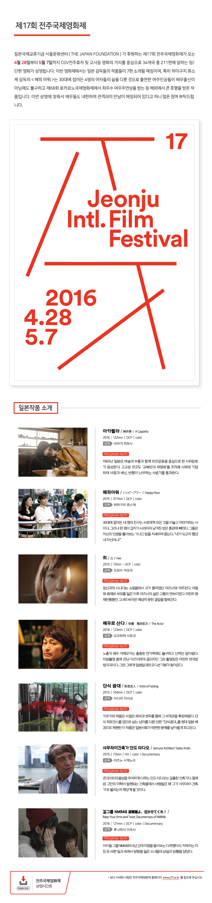 일본국제교류기금 서울문화센터(THE JAPAN FOUNDATION)가 후원하는 제17회 전주국제영화제가 오는 4월 28일부터 5월 7일까지 CGV전주효자 및 고사동 영화의 거리를 중심으로 34개국 총211 편에 달하는 장/단편 영화가 상영됩니다. 이번 영화제에서는 일본 감독들의 작품들이 7편 소개될 예정이며, 특히 하마구치 류스케 감독의 <해피 아워>는 30대에 접어든 4명의 여자들의 삶을 다룬 것으로 출연한 여주인공들이 배우출신이 아님에도 불구하고 제68회 로카르노국제영화제에서 최우수 여우주연상을 받는 등 해외에서 큰 호평을 받은 작품입니다. 이번 상영에 맞춰서 배우들도 내한하여 관객과의 만남이 예정되어 있다고 하니 많은 참여 부탁드립니다.
