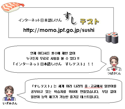 「すしテスト」는 일본국제교류기금이 일본어학습입문단계의 학습자(중/고등학교의 일본어 학습자)를 위하여 개발한 인터넷상의 일본어능력테스트 무료 서비스입니다. 본인이 획득한 점수에 상응하는 스시가 제공되므로 본인의 일본어 능력 확인은 물론 다양한 스시를 모으는 재미도 제공합니다.- すしテスト사이트 바로가기