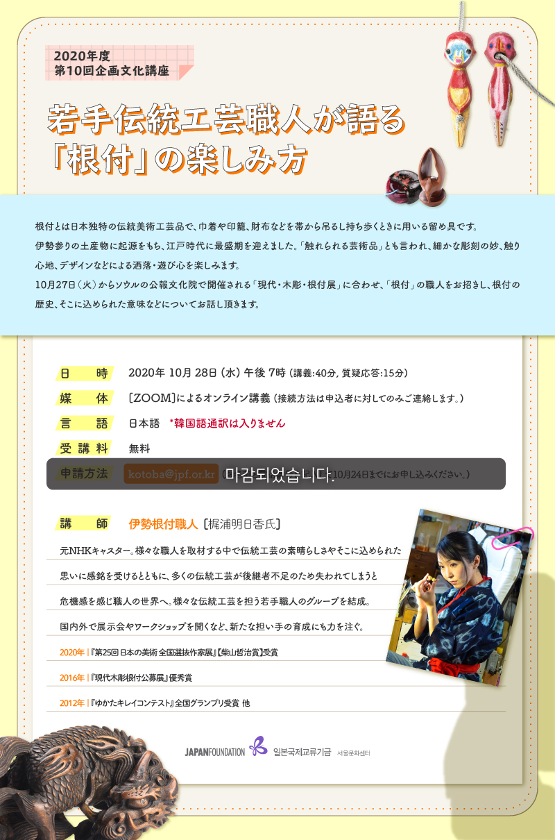 根付とは日本独特の伝統美術工芸品で、巾着や印籠、財布などを帯から吊るし持ち歩くときに用いる留め具です。 伊勢参りの土産物に起源をもち、江戸時代に最盛期を迎えました。「触れられる芸術品」とも言われ、細かな彫刻の妙、触り心地、デザインなどによる洒落・遊び心を楽しみます。 10月27日(火)からソウルの公報文化院で開催される「現代・木彫・根付展」に合わせ、「根付」の職人をお招きし、根付の歴史、そこに込められた意味などについてお話し頂きます。