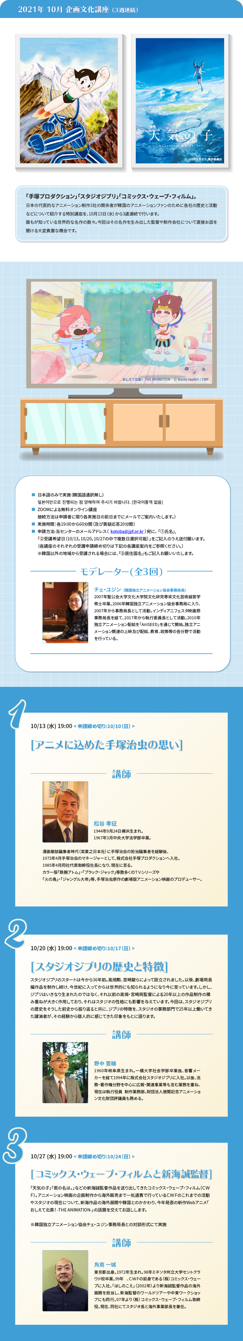 日本の代表的なアニメーション制作3社の関係者が韓国のアニメーションファンのために各社の歴史と活動などについて紹介する特別講座を、10月13日(水)から3週連続で行います。