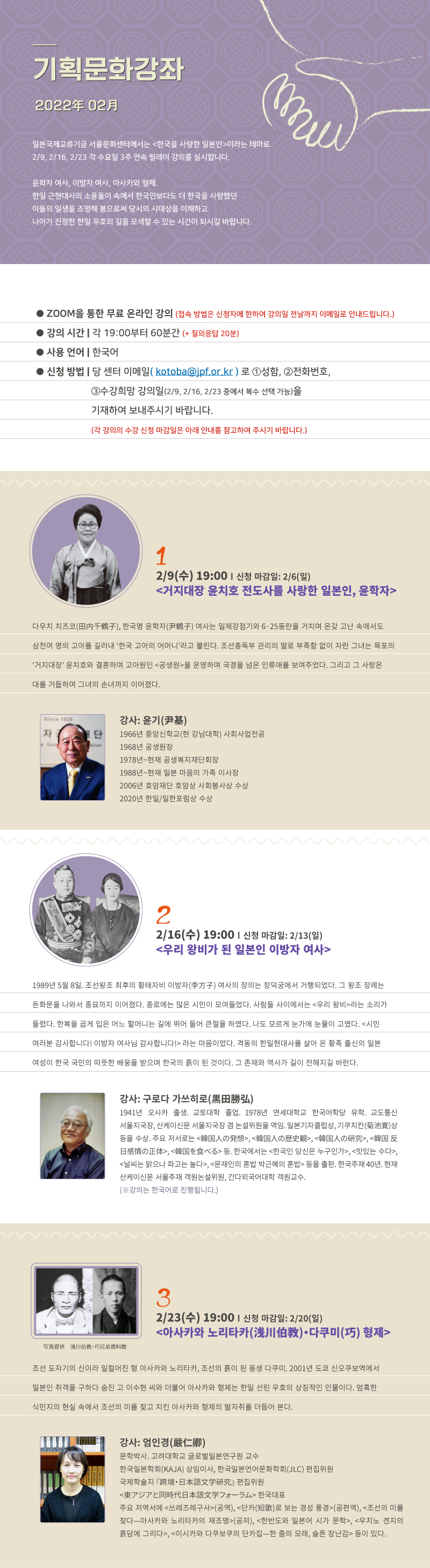 일본어커뮤니케이션 일본국제교류기금 서울문화센터에서는 <한국을 사랑한 일본인>이라는 테마로 2/9, 2/16, 2/23 각 수요일 3주 연속 릴레이 강의를 실시합니다.