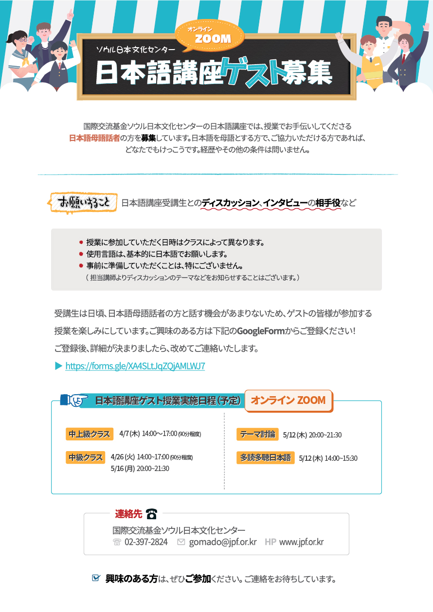国際交流基金ソウル日本文化センターの日本語講座では、授業でお手伝いしてくださる日本語母語話者の方を募集しています。日本語を母語とする方で、ご協力いただける方であれば、どなたでもけっこうです。経歴やその他の条件は問いません。